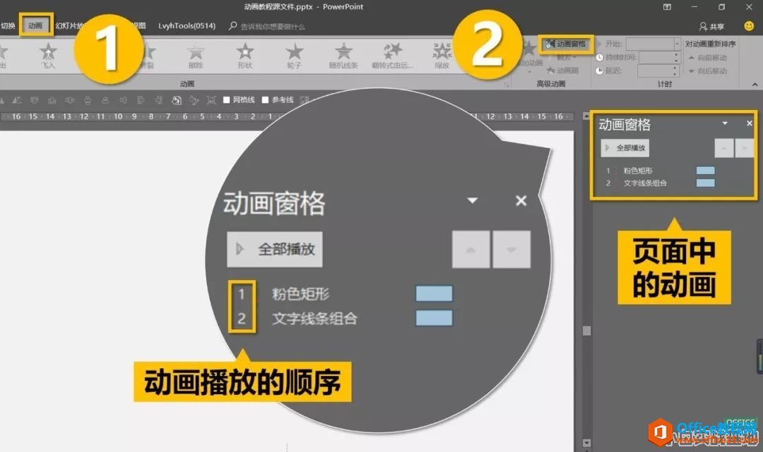 点击【动画】-【动画窗格】,此时你可以看到我们设置过的所有动画,每个动画前都会有一个序号,这表示它们的播放顺序: