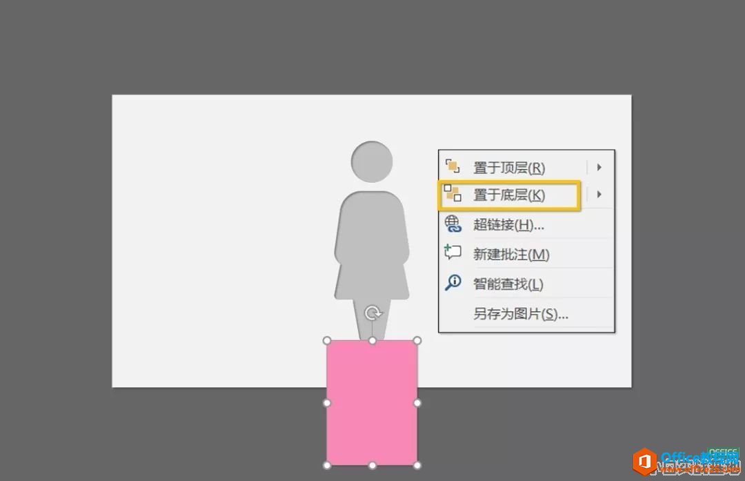 随便插入一个矩形,设置为粉色,并右击选择【置于底层】,把它放在镂空矩形的下方: