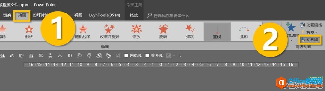 先选中粉色矩形,点击【动画】-【动画刷】,此时鼠标就变成了一个刷子,接着点击那个组合,这个组合的动画也就设置好了: