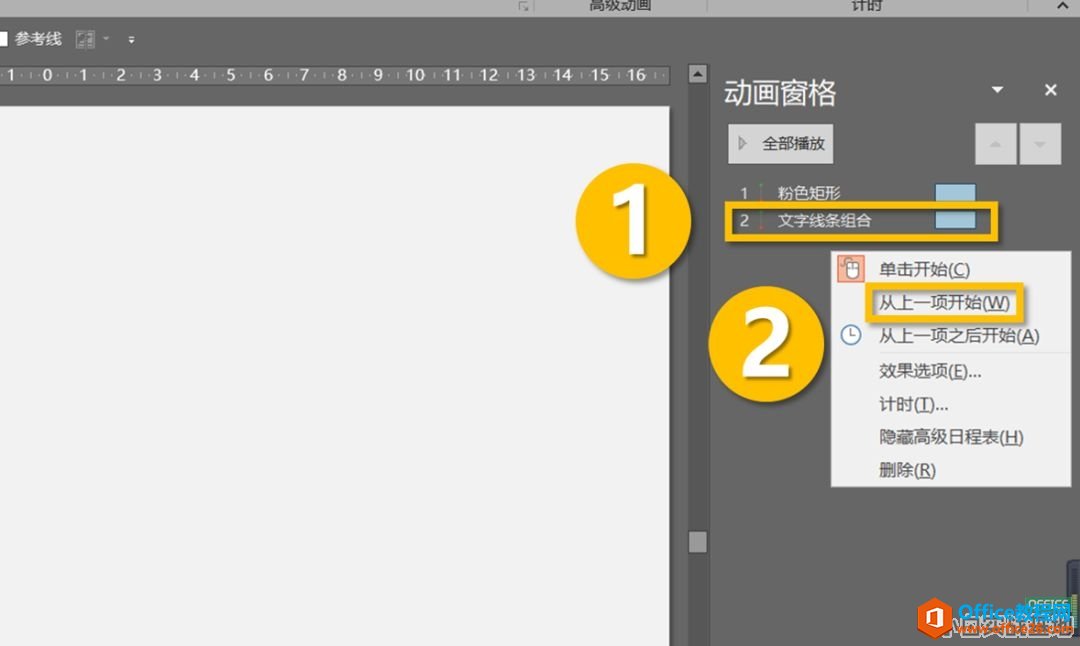 现在右击第二个动画,选择【从上一项开始】,这样你就能让第二个动画跟第一个动画同时播放了: