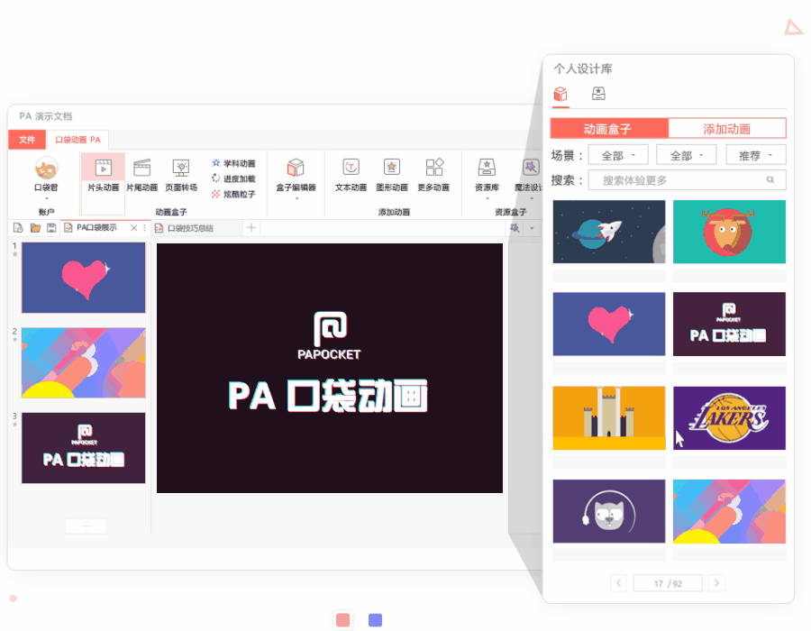 PA口袋动画功能强大,有很多炫酷的动画效果,包括片头动画、片尾动画、快闪动画、文本动画等、页面转场等等,可以说,使用它,你的PPT动画不再单调!