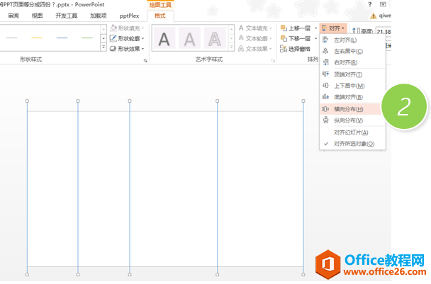 这个时候用参考线就不太方便了。我们利用对齐功能快速搞定。具体方法如下:画五根线,最外面两根分别在PPT页面边缘,然后选中所有的线,点击“绘图工具—格式—对齐—横向分布”搞定。(下图2处)