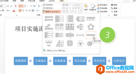 在出现的窗口中,选择“基本流程”(下图3处),之前的文字就会快速转化成流程图。是不是非常方便!