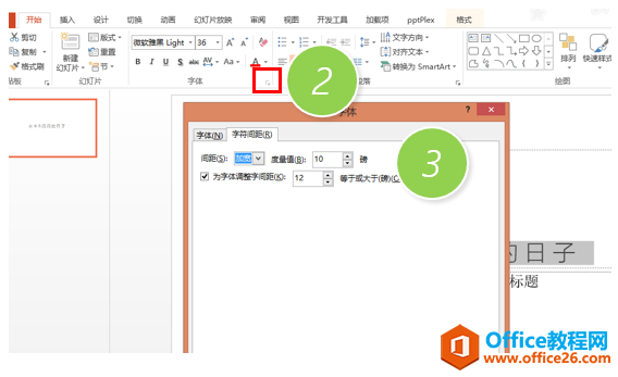 单击“字体”组的对话框启动器,(下图红色处:2处),切换至字体的字符间距界面。并设置间距的度量值为10磅。(下图3处)