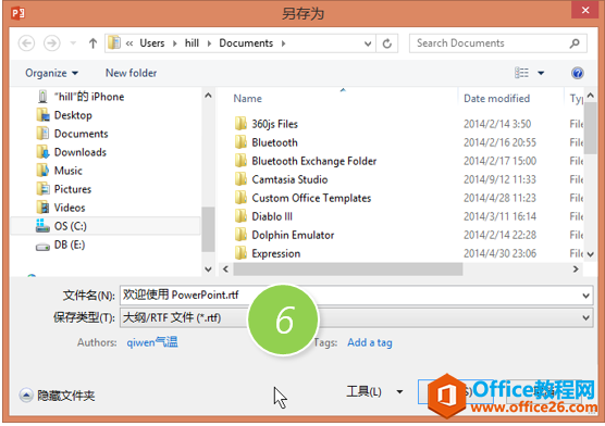 将保存类型改为“大纲/RTF文件”。(下图6处)