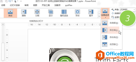 还没完,在“效果选项”中确定你的“手滑”方向。(下图3处)如果你每页方向不一样,需要单独设置方向。然后你就可以牛牛的在投影机前手滑方向了…..