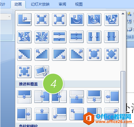 总结:推送的切换功能在PPT2010以上版本都在“切换”选项卡,PPT2007版本是在“动画”选项卡。(下图4处)