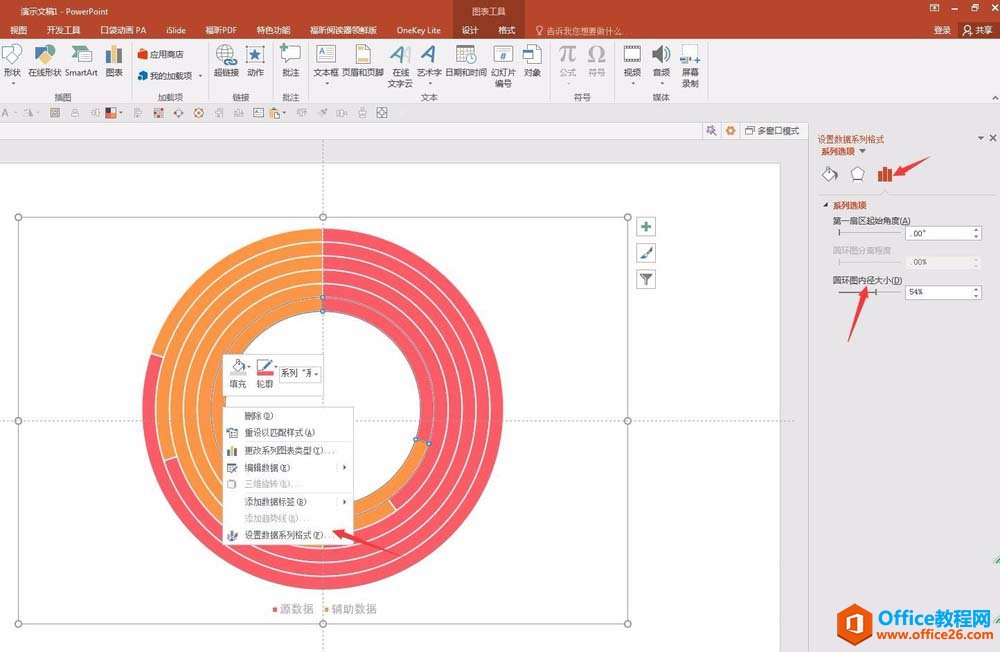 3、右键点击圆环,选择设置数据系列格式,在右侧打开的窗口中,点击系列选项,调整下方圆环图内径大小。