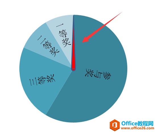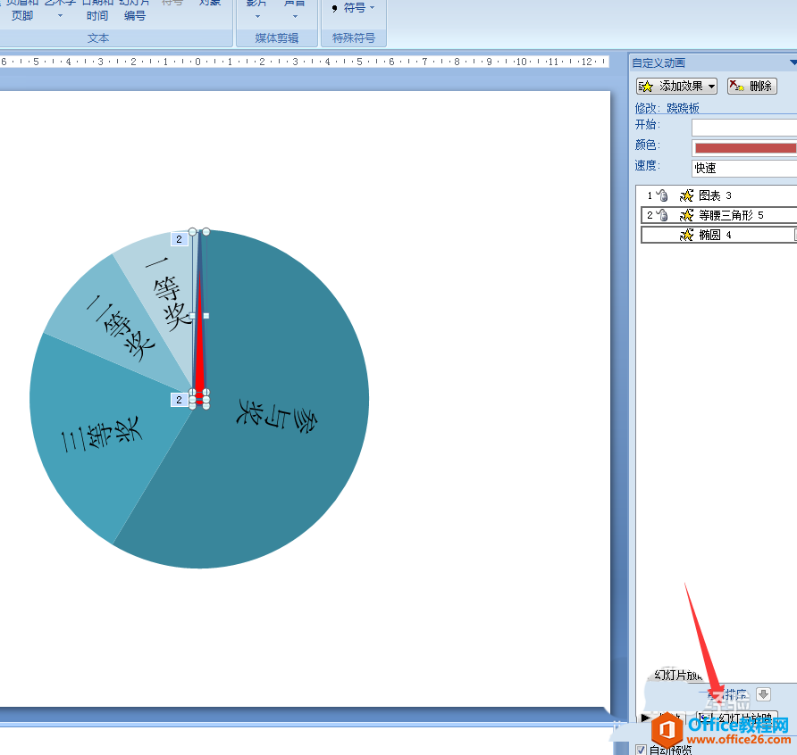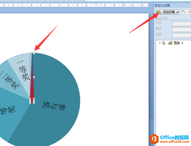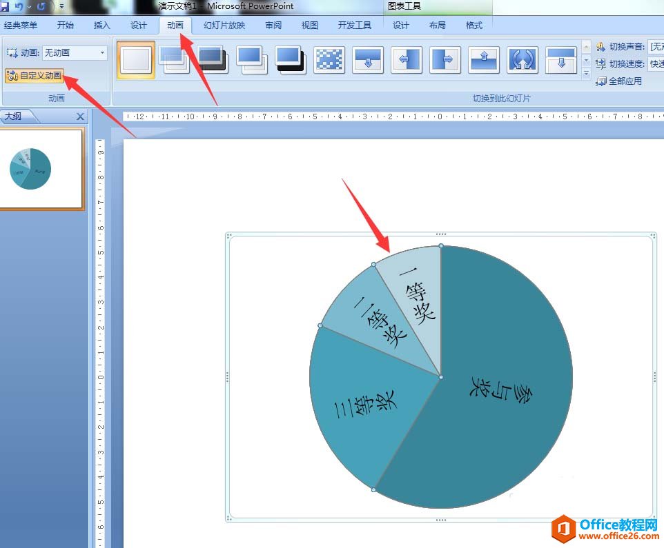 6、例如下面的图片中,饼图里分别输入了一等奖、二等奖、三等奖和参与奖。文本的位置要自己拖动设置,并旋转文本以适应饼图。文本设置好后,选中饼图,再选择动画,点击自定义动画。