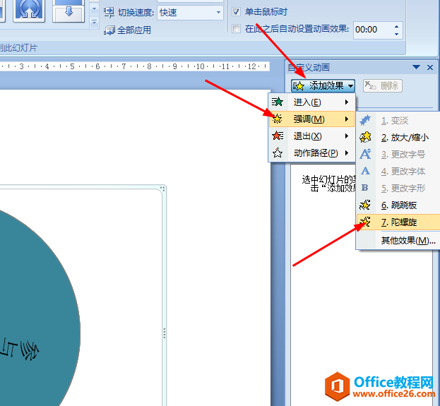 7、在右边点击添加效果,选择强调里的陀螺旋。