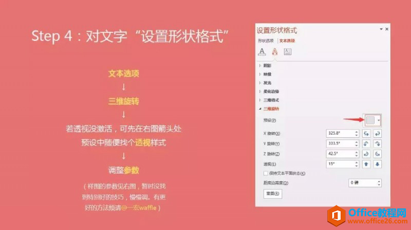 三、确定一个合适的字体,为手写字体样式,并经过设置形状,选择文本三维旋转,调整适当角度让其符合之前背景图片的书写角度即可。