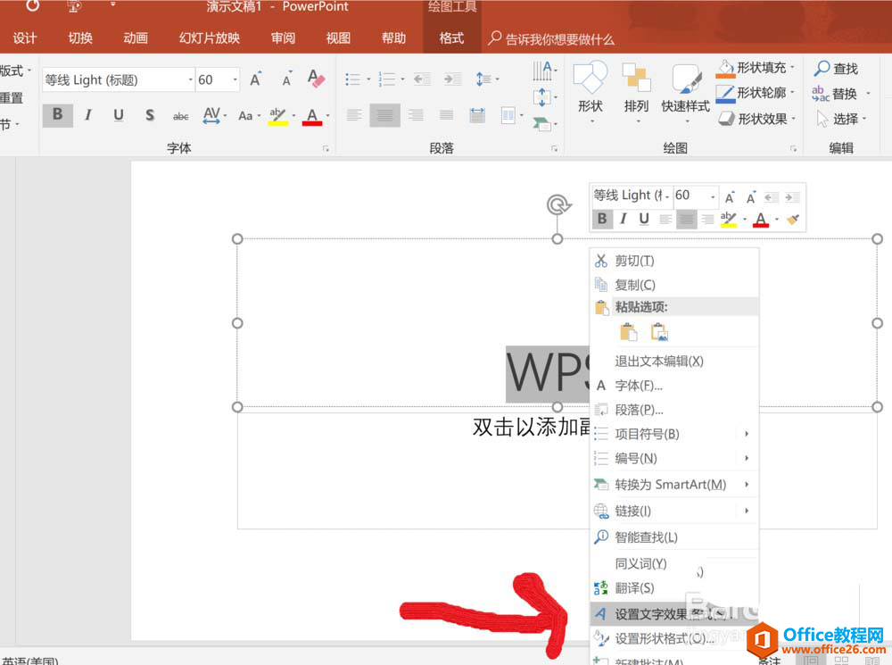 2、接着选中文字,点击鼠标右键选择“设置文字效果格式”,就可以进行编辑了。