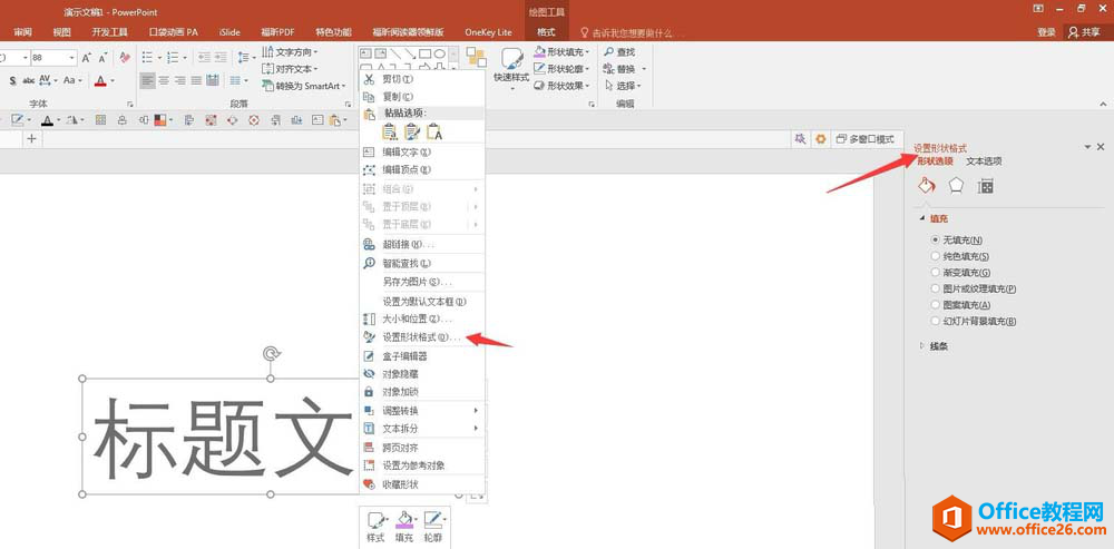 2、右键单击文本,选择“设置形状格式”,右侧将打开格式设置窗口。