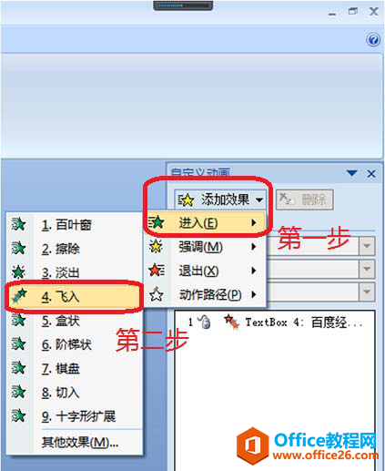 1、选中第二个文本框,然后点击右侧自定义动画栏的“添加效果”,在弹出框中选择“进入——飞入”。滑动光标选中“飞入”效果。第二个文本框的动画效果就是单击鼠标时,快速飞入。