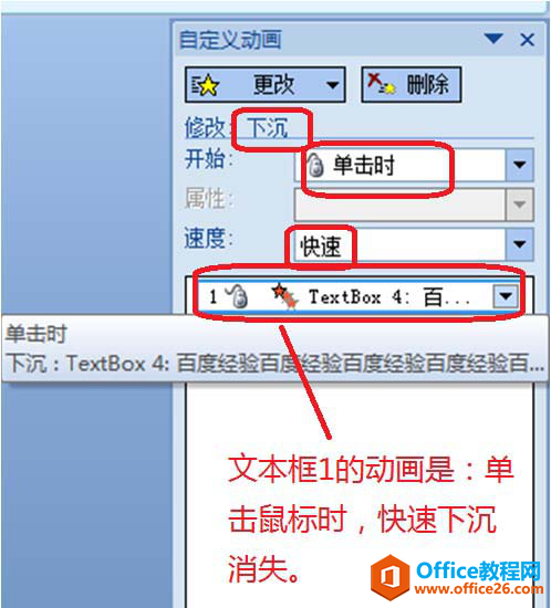 3、设置好的第一个文本框的动画是:单击鼠标后,文本框一就会快速下沉消失。