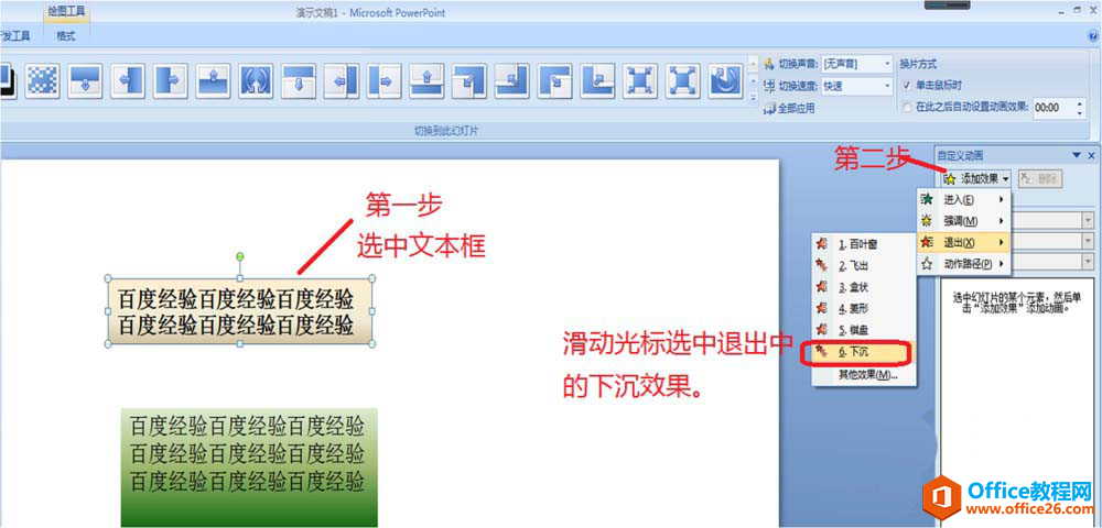 2、选中第一个文本框,然后在右侧自定义动画栏中的找到“添加效果”,点击添加效果右侧的小箭头,在弹出框中选择“退出——下沉”。