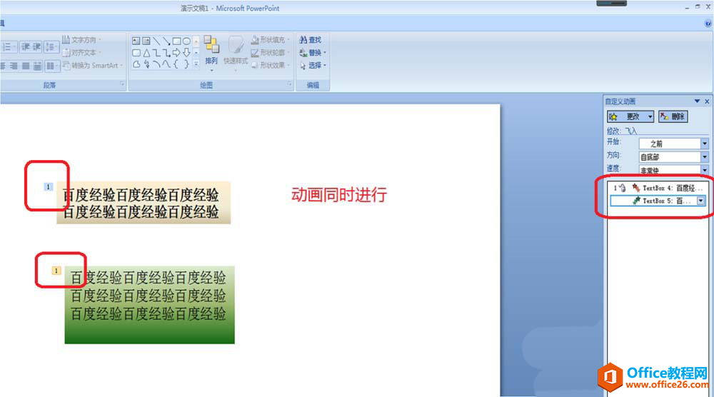 3、设置好以后,可以看出,文本框1和文本框2的右侧都是有一个“1”,这表示,这两个文本框的动画同时进行。播放ppt,查看设置效果。