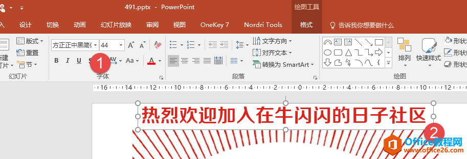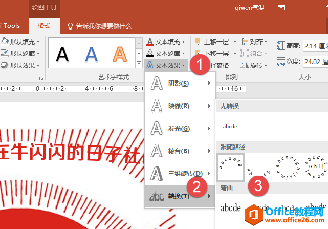 接下来是本技巧的重点,利用PPT的艺术字的转换设置功能,将文字弧度化。