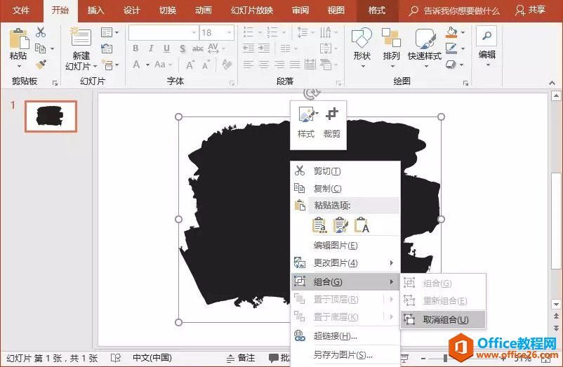 (4)先选中图片,再按住【Ctrl】选中下方的墨迹,执行【格式】-【合并形状】-【相交】命令,即得到墨迹效果。