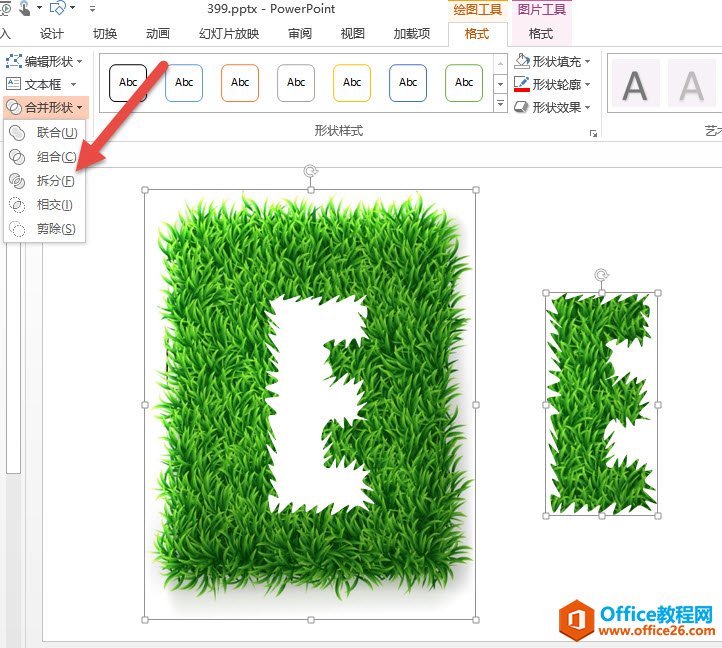 最后利用拆分工具(下图箭头处),将其拆分掉,注意先选中草地图片,再选中曲线图形,才能拆分成功。