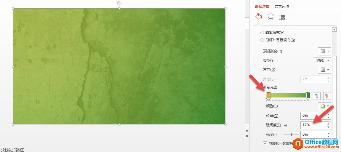 这样不是前面那张背景给挡住了?不急,设置渐变图形的透明化,不能直接使用常规的其他颜色设置中的透明设置。而是需要对渐变的上图箭头处的几种颜色分别设置透明度,设置到17%左右。如下图红色箭头处。