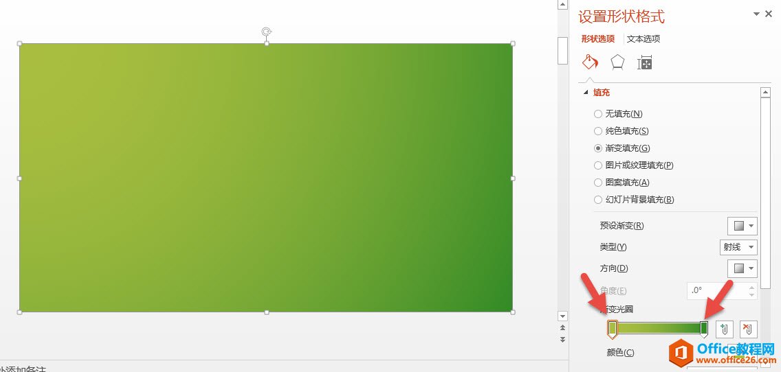 然后利用设置绿色渐变烘托背景气氛,插入一个长方形并设置如下渐变。