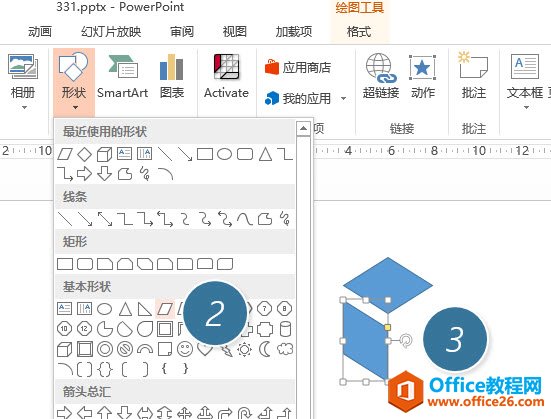 新建一个PPT,点击“插入—形状—菱形”。拖拽一个菱形,注意调整菱形的角度。(下图 1 处)