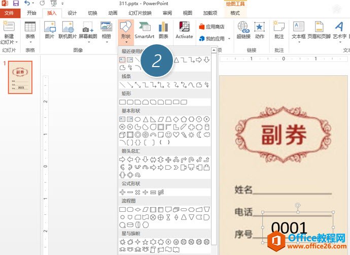 并在“插入-形状-文本框”插入文本框,写好抽奖劵编号。下图 2 处
