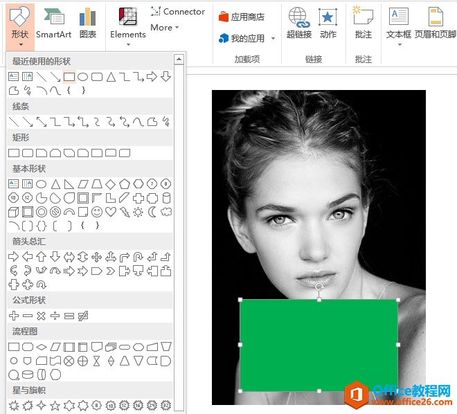 紧接着插入一个长方形图形,将其设置颜色,注意边框线设置为无,效果如下图所示: