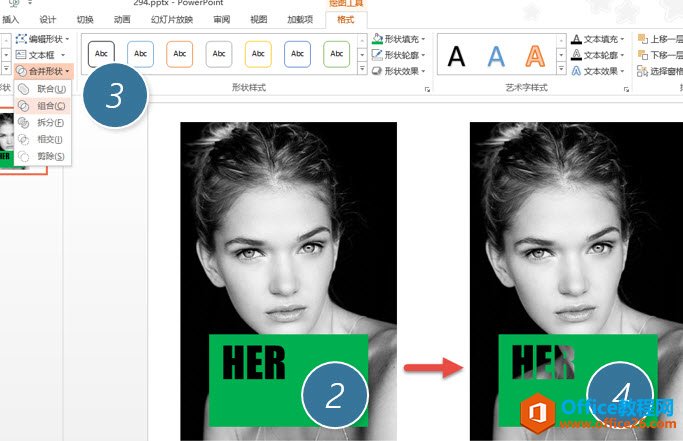 紧接着在下图中,输入文本框英文HER,并设置一个较粗的字体效果,分别选中绿色图形和字体,点击格式中的组合功能,PPT就会自动镂空文字。