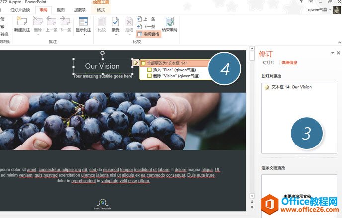 这个时候两个PPT就会进行比较,并把比较的结果放在右侧的修订框中(下图 3 处),同时在修改过的地方显示批注标识修改的过程。(下图 4 处)
