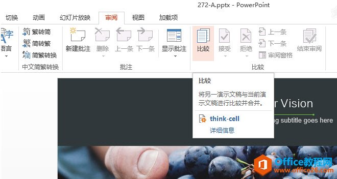 打开272-A.pptx,然后在“审阅-比较”中打开272-B.pptx,也就是同事编辑好的那个PPT。
