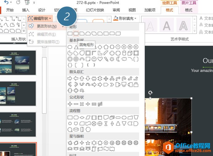 将第五页的图片的轮廓改由长方形改为圆角矩形。利用“编辑形状”按钮,下图2处。