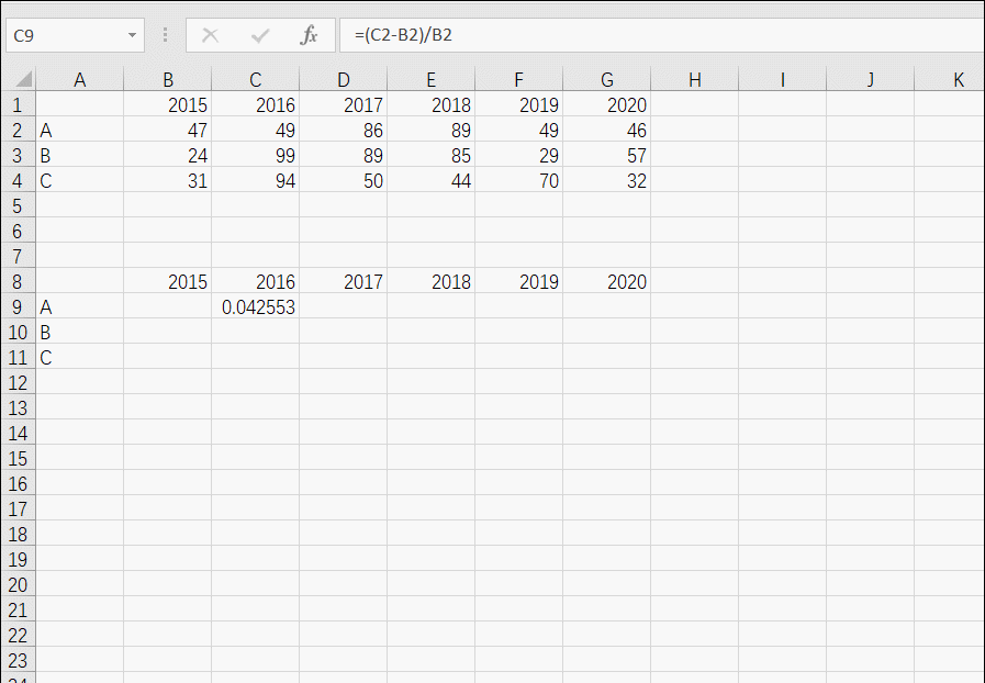 接着将其转换成环比增长,首先要搞清楚什么叫环比增长。以下图为例,A产品的2016的数据减去2015年数据额差值除以2015年的数据的比值,这个比值就是在原有2015数据的基础上2016增长了百分之多少,就称之为环比增长。如果实在看不懂,就按下动图的公式模仿。
