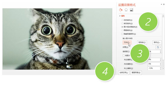 然后在右侧菜单中,选择“图片或纹理填充”,在文件中插入图片,这时候图片会按页面尺寸铺满整个PPT。如下图3处。然后单击“全部应用”。