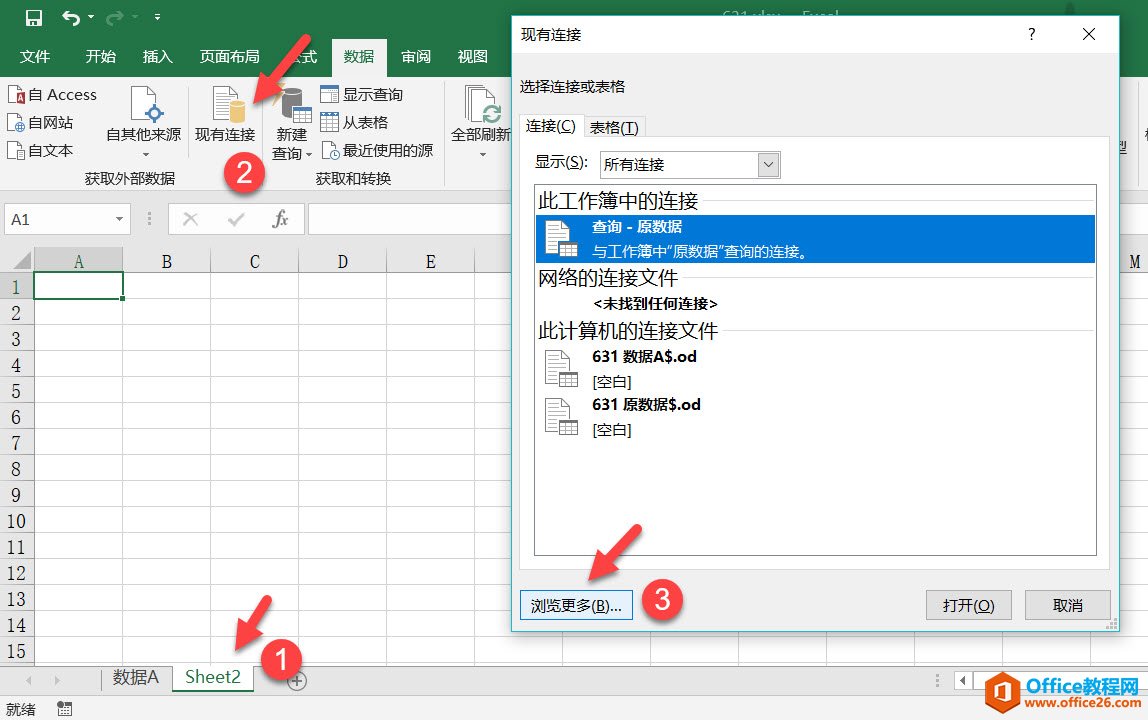 首先在新工作表中点击数据-现有链接-点击浏览更多 按钮,如下图3处。