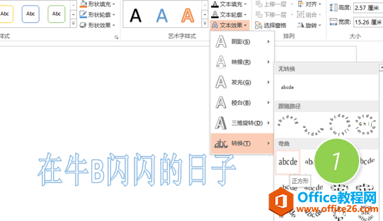 单击在艺术字的 “文本效果—文本转换—正方形”(下图1处)