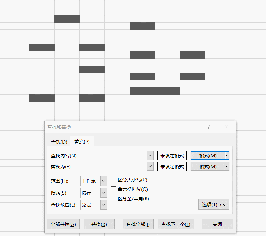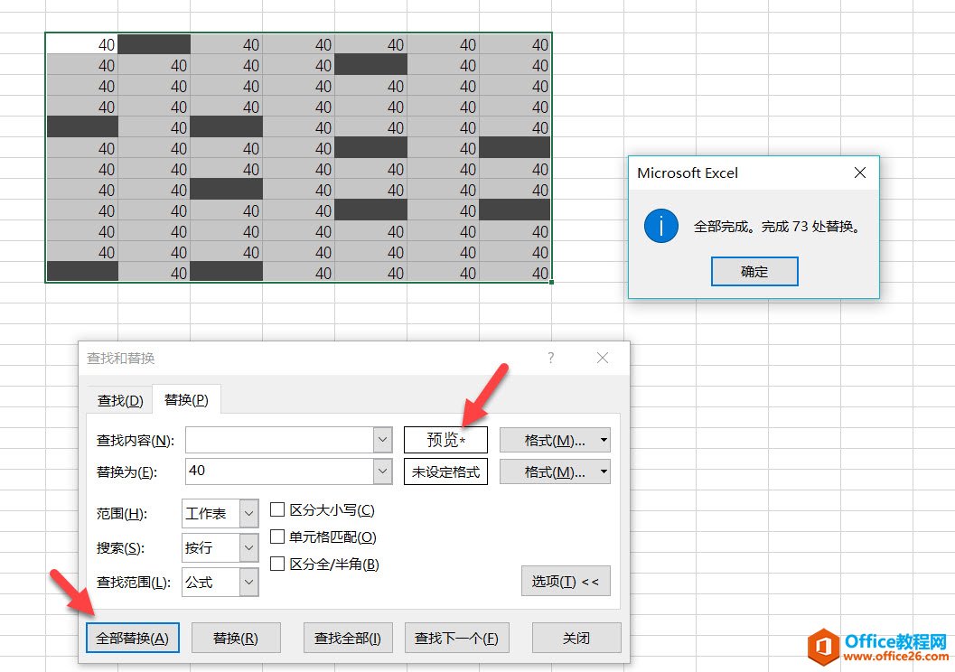 选上去后查找内容处好像没啥东西嘛,注意重点在那个“未设定格式”改成了“预览”,多看看上面动图的操作。接着在替换为输入需要的内容,比如40,如下图。点击全部替换后,白色单元格就输入了相同的数值。