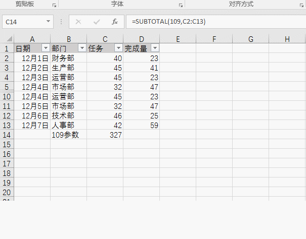 看到没,筛选财务部的数据,自动统计财务部数据的和。但这个函数很妖,因为求和他还有一个参数109,请看动图: