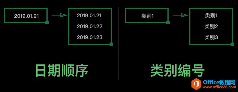 日期,金额等有规律变化的数字,都可以进行快速拖拽复制,在拖拽的过程中,excel会顺带进行有规律的变化。比如图1.8所示,日期会变成顺序日期,类别的编号也会递增,这样就不需要手动去修改了。