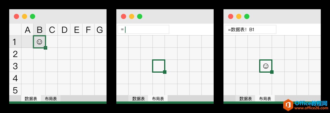 在制定了基本的布局和框架之后,就可以将第一步中的积累的数据(见图1.2)关联同步到布局之中。这里面有个技巧,就是关联的时候,需要在上方excel自带的文本框中填写“=数据表!B1”。数据表是数据来源,B1是被关联数据的行列编号。
