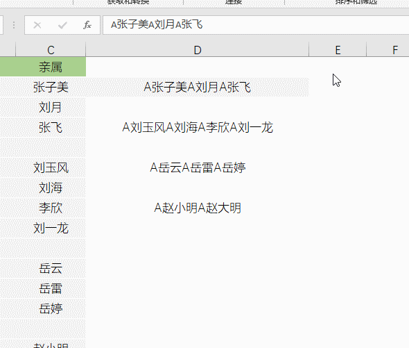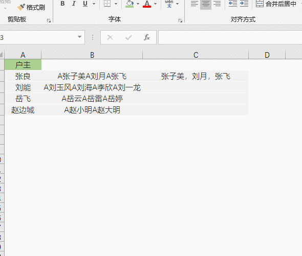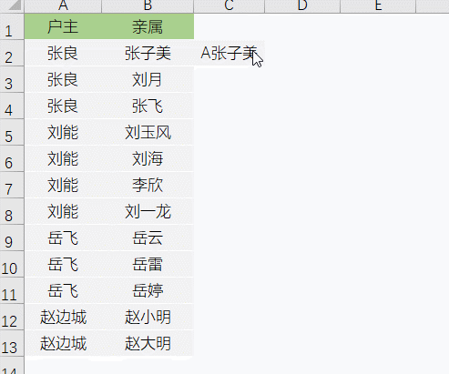 【例】如下图所示,现需把AB列表格,转换为DE列格式,同户主的B列合并到一个单元格中。