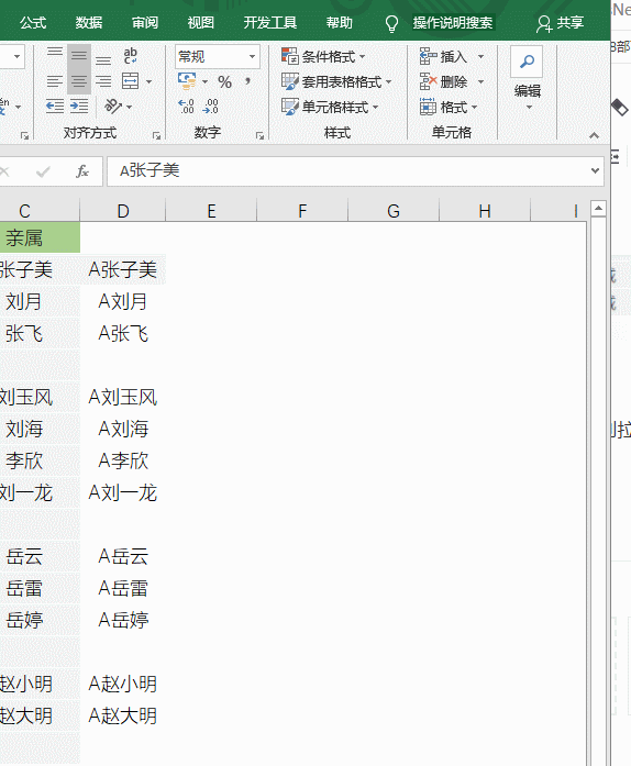 先在 C2输入 A张子美,再选中C3按Ctrl + E即可在 姓名前快速添加字母A
