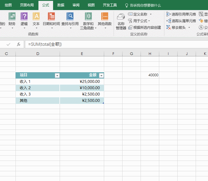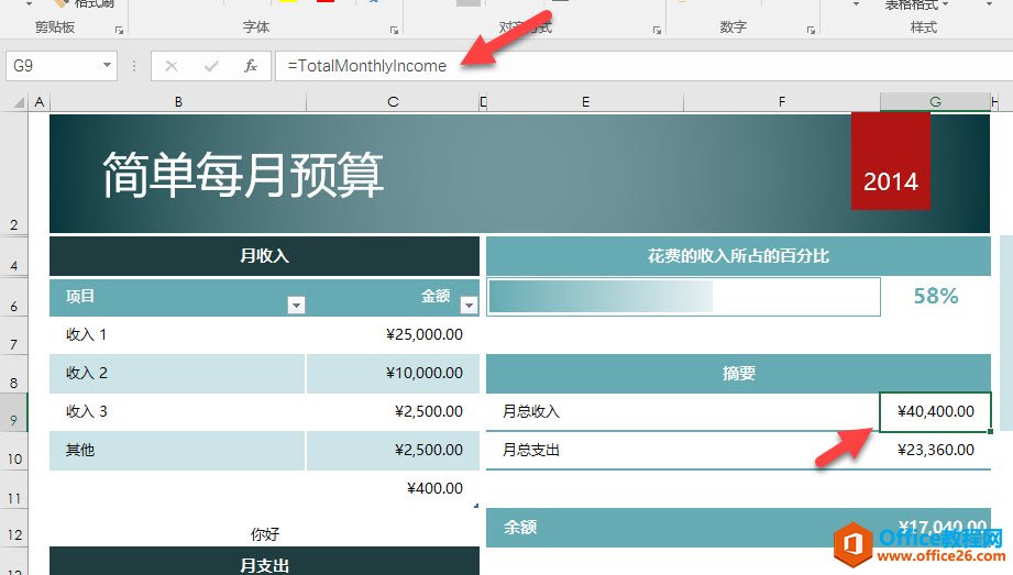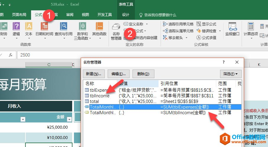 注意看图的箭头处,将SUM函数定义一个名称为TotalMonthlyIncome。那如果我们也想实现这样的效果应该怎么玩呢?