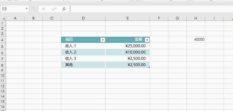 同样在E9单元格输入数字,H4也会自动统计。看动图操作。