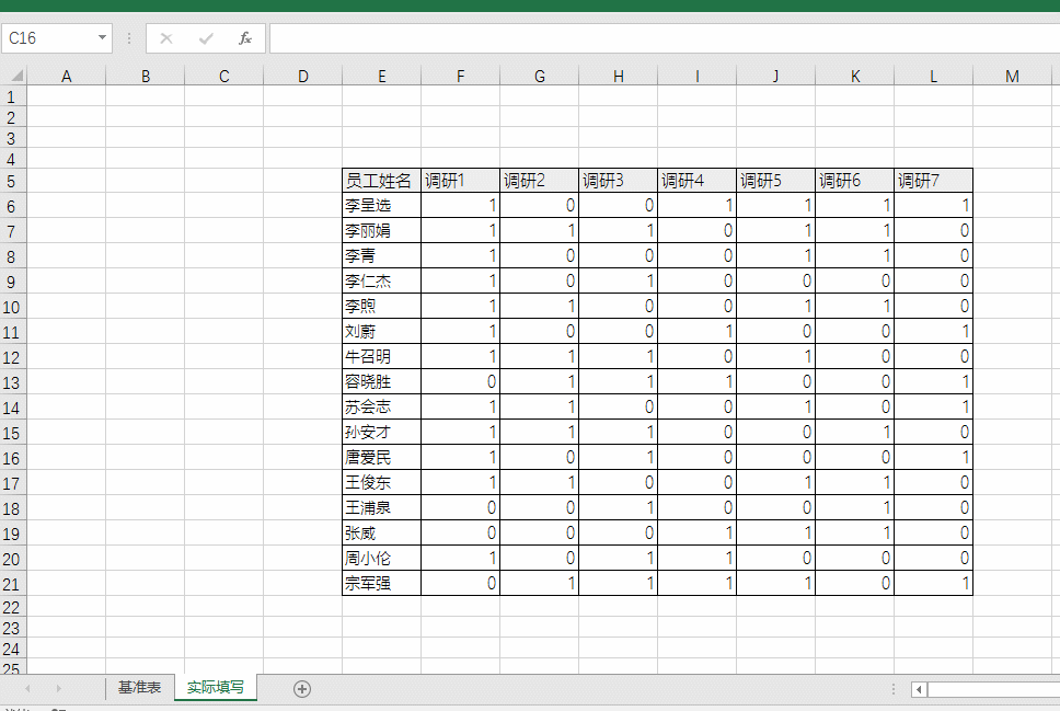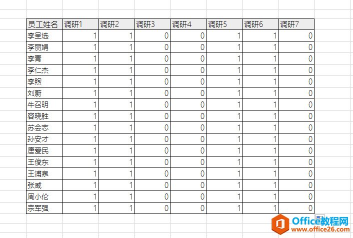 调研表的结构大致如下,左侧人名,上次是调研的题目,下面是选项,输入选择1或0,表示答案的正确。