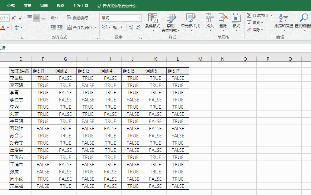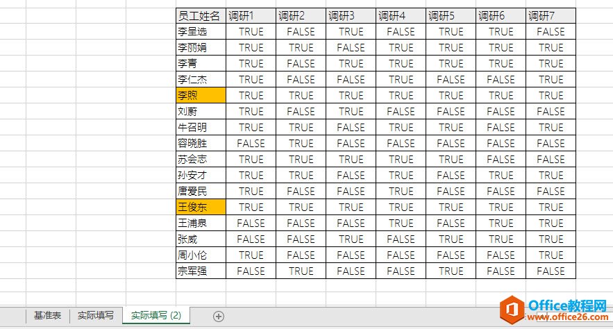 判断完毕后,就会发现如果和基准表单元格一样,那么所有调研对应单元格都是TRUE。看下图红线处。