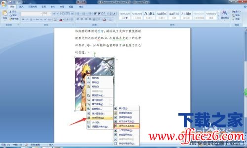 4、因此我们就要对图片进行有一些设置。右键单击已插入的图片,选择文字环绕——浮于文字上方。
