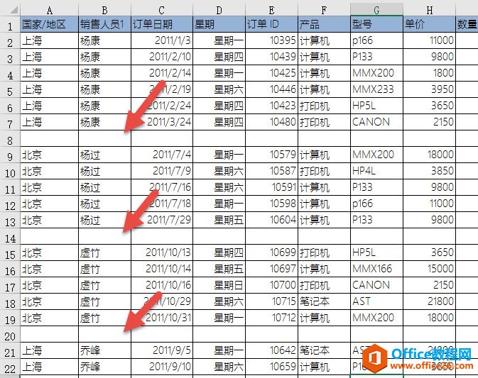 排序完毕之后,还是利用F5定位,实现批量合并,只是在定位前需要对数据进行一个处理,处理的方法也很简单,及时在不同的姓名直接空一行。设置成如下效果: