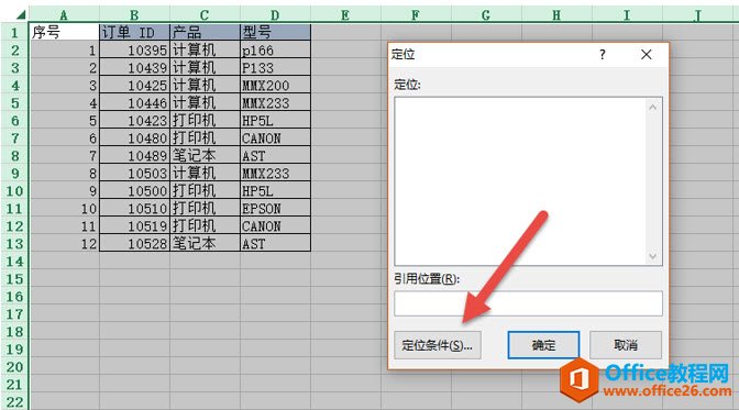接着按键盘上的F5键。填出定位窗口,单击下图的“定位条件”。(下图箭头处)